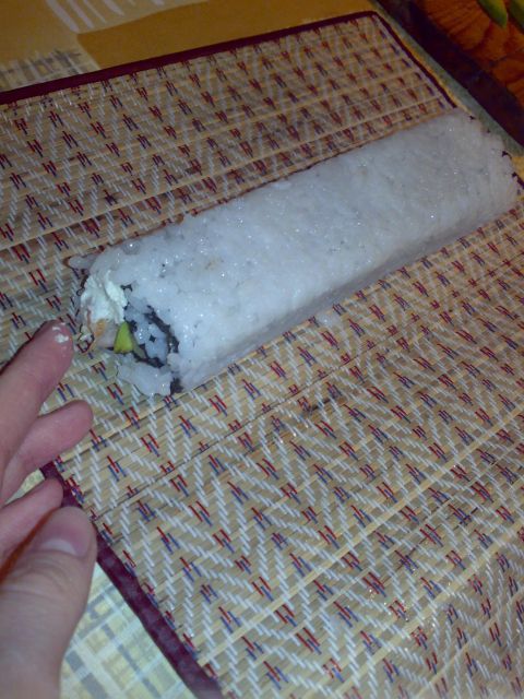 Заворачиваем урамаки, как обычный ролл, главное - поплотнее, чтобы он не развалился. Подоткните начинку с краев, если она вылезла.