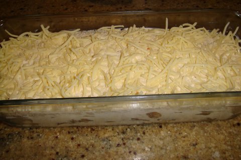 Описание изображения: Посыпать сыром и поставить в разогретую до 200*С духовку на 15-20 мин до образования румяной корочки.