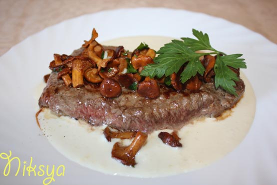 Филе говядины с соусом пармезан и лисичками