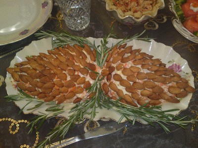 Оригинальный салат из серии слоистых. Мой морковный- тёртая свежая морковь +молотый грецкий орех +пропущенный через пресс чеснок +посолить и заправить майонезом и несладким биоёгуртом взятым один к одному.Сформировала шишки ,украсила миндалём и веточками розмарина. Вкусно, малокаллорийно, думаю Новогодний кролик был доволен!