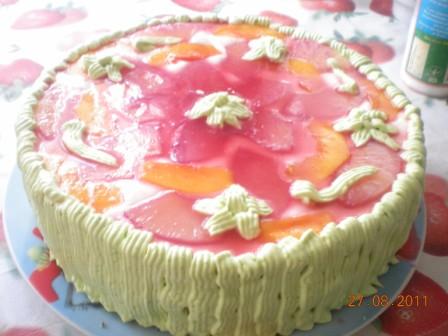 бисквит+ананас консерв.+взбитые сливки с желатином+ сверху фрукты залитые желе