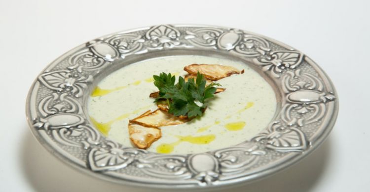 Описание изображения: Крем суп с чипсами из сельдерея