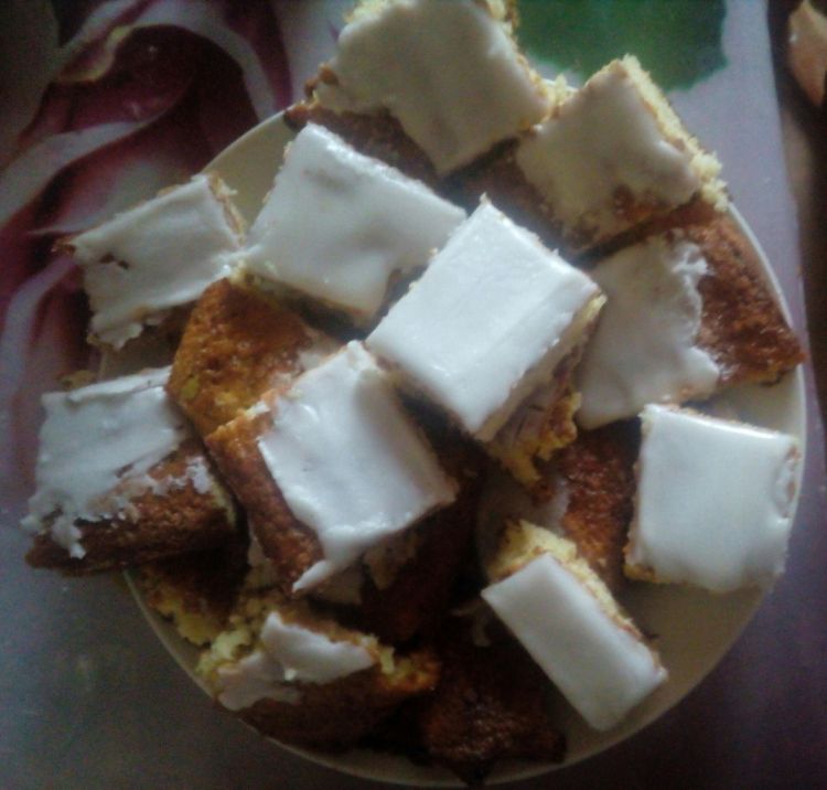 7)Глазурь - высыпать сахарную пудру высыпать в глубокую тарелку и выжить лимон(лимонный сок) перемешать и покрыть этим пирог и разрезать его !