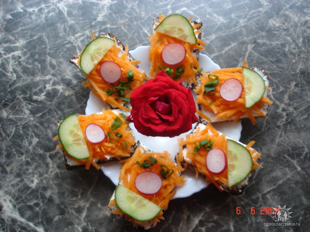 На ломтик чёрного хлеба с любыми зёрнами,намазать любым свежим сырком. Наверх положить,на тёртую на крупной тёрки свежую морковь. На одну сторану положить дольку свежего огурца,кружочик редиски,немного зелёного лука пожиланию.