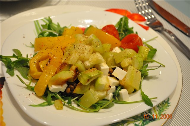 Теплый салат с чечевицей