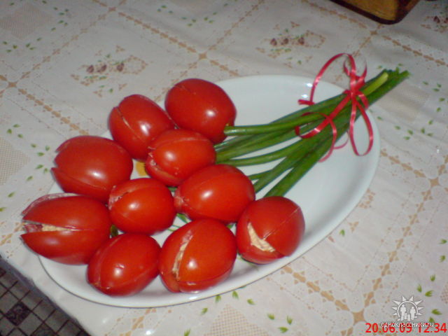 Описание изображения: Помидоры,желательно продолговатой формы,надрезаем на 4 части(недо конца).Аккуратно ложечкой вынимаем мякоть ,и также аккуратно начиняем.