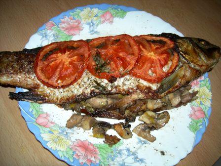 Карп,запечёный с луком-пореем и грибами
