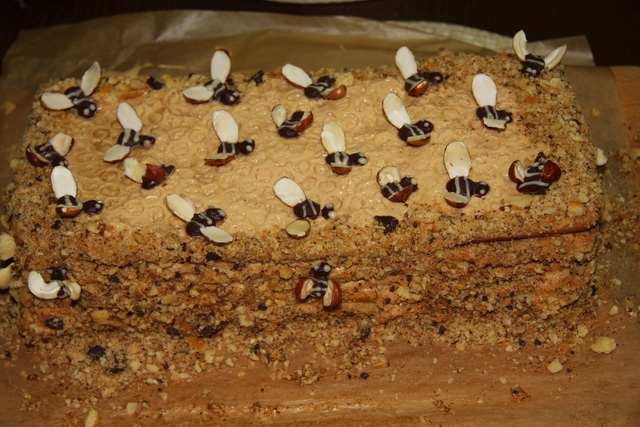 Спасибо огромное, Ирина, за рецепт чудесного медовика, очень вкусно, а главное красиво, делала тортик на Рождество. Коржи испекла заранее, получилось 8 вот таких прямоугольных коржа, готовятся очень быстро, я пекла духовке сразу на двух протвенях, таким образом получилось 4 коржа за раз, пришлось повозиться с пчелами, но их получилось так много, что выбирала после заморозки самые красивые и удачные,