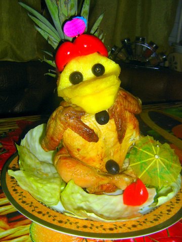 Описание изображения: ананас в кожуре вырезается так чтоб куреца села устойчиво(ну в основном кожура)... садится курица потом делаю голову нижнюю челюсь зубочисткой соединяю с верхней и одеваю на курицу сверху на голову я одела для коктелей украшение и перец, глаза с оливок и лапки с перца)))