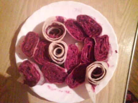 отварить свеклу. потереть ее на терке. добавить майонез, чеснок и соль. все смешать. размотать лаваш смазать его и свернуть. нарезать кусочками.