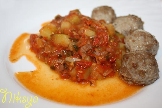 Кабачок с помидорами и луком, с тефтелями по-хайлендски