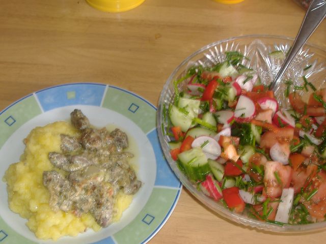 Картофельное пюре с куриными сердечками и овощной салат.
