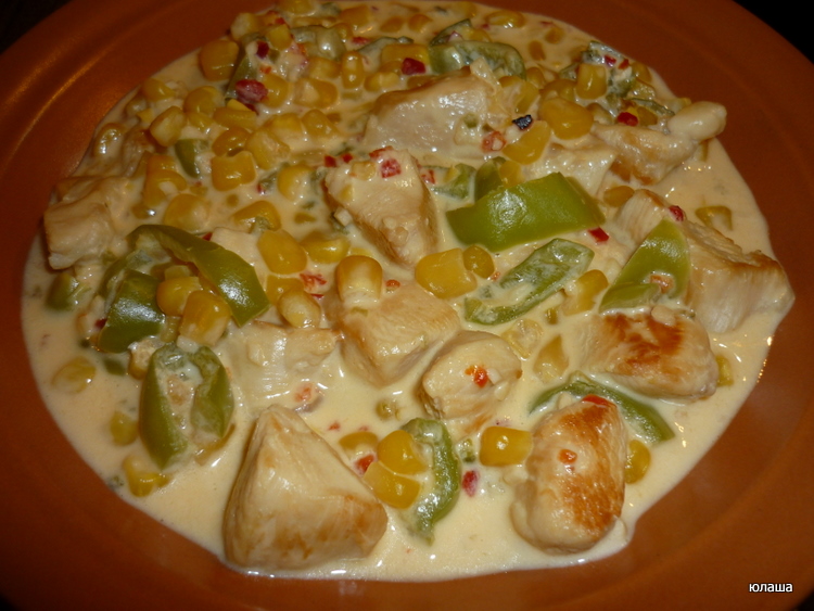 куриное филе тушеное со сладким перцем и кукурузой в сметанном соусе