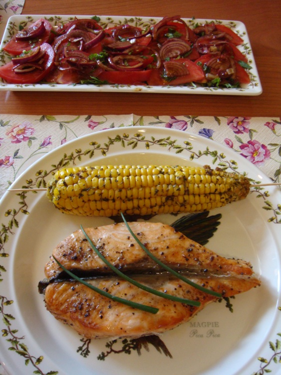 кукуруза в специях и рыба на гриле с bourbon smoked
