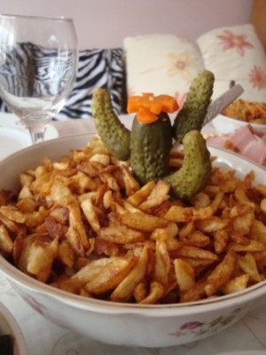Вы можете сделать любой вам понравившийся салат и выложить на блюдо. сверху украсить жареной картошкой фри и маринованым огурчиком и цветочком из морковки