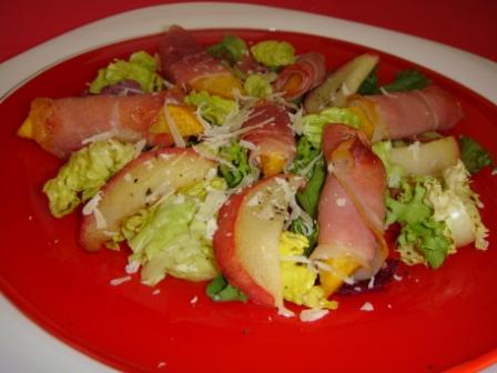 салат с персиком и ветчиной