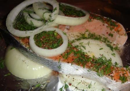 Лосось с укропом на луковой подложке