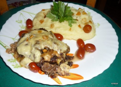 говядина с грибами и сырным картофельным пюре