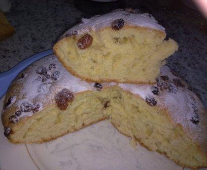 3 яйца и 1 ст сахара хорошо взбить... 5 ложек майонеза...1,5 стакана муки, сода, изюм,лимон...