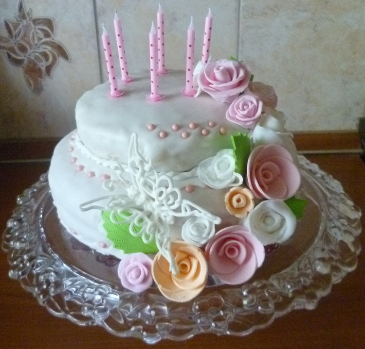 Выпечь бисквитные коржи по любому рецепту, промазать их любимым кремом,собрать отдельно каждый ярус торта. Мастику раскатать, обтянуть ею каждый ярус и уложить друг на друга. Из мастики вылепить украшения-цветы, листочки, узоры,прикрепить их на торт. Бабочку сделать из айсинга накануне, т.к. сохнет она 2-3 дня.