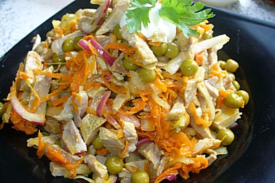 Свинину отварить до готовности, охладить в бульоне. Порезать тонкой соломкой. Лук нашинковать тонкими полукольцами, залить маринадом, оставить мариноваться минут на 30-40. Морковь натереть на крупной терке, обжарить в ст.л. растительного масла без запаха, остудить. С горошка слить жидкость. В глубокой миске смешать порезанное мясо, отцеженный от маринада лук, морковь и горошек, заправить майонезом, при желании досолить. Выложить в салатник и сразу же подать к столу.