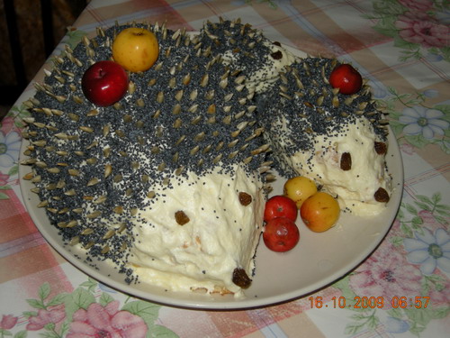 Сверху тортик обильно посыпать маком,исключая область мордочки.На маковую поверхность часто "навтыкать" семечек-это иголки.Из изюма сделать глазки и нос.Можно добавить еще элементы,в данном случае это мелкие яблочки-китайка.