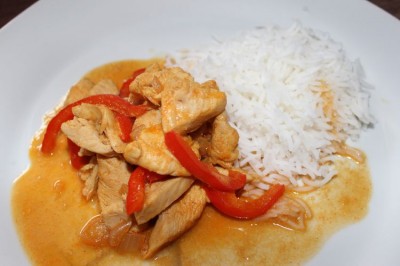 Обжаривать ещё минут 10, потом добавить маринад, кокосовое молоко, сливок и воды немного. Пару минут потушить и попробовать на вкус. По необходимости посолить, добавить специи и соевый соус.