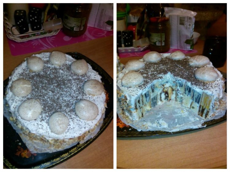 Через 1,5-2 часа крем застывает и мы легко можем снять форму. А дальше украшаем как фантазия подсказывает. Я взбила сливки обмазала торт, бока посыпала обрезками от рулета предварительно из раскрошив. Сверху натерла не много шоколада и украсила безе.