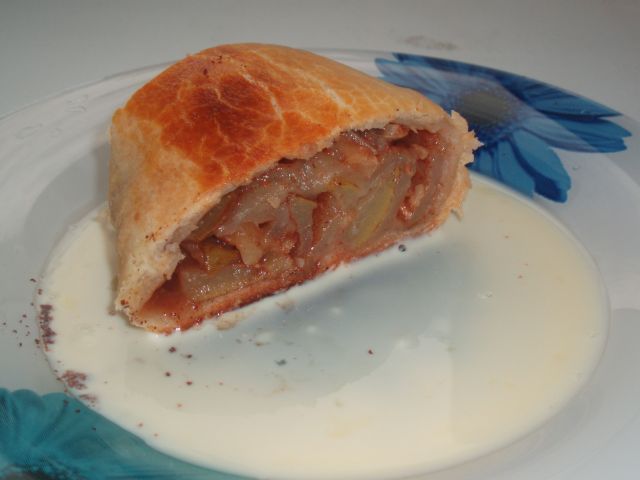 Понадобится: упаковка слоеного теста, груши конферанс спелые, но не мягкие(полкило),100гр.сахара, измельченые грецкие орехи, молотая корица, изюм без косточек (50гр. - у меня был черный и белый, но это не обязательно), панировочные сухари, 1 яйцо, сахарная пудра, 100 мл. сливок 20%, 2 желтка, ванилин, 1 пакетик ванильного сахара, 1 чайная ложка рома или коньяка (по желанию). Тесто раскатать на пласт прямоугольной формы (не очень тонко), посыпать сухарями, разложить на нем порезанные груши, посыпать сахаром, изюмом, орехами и корицей.