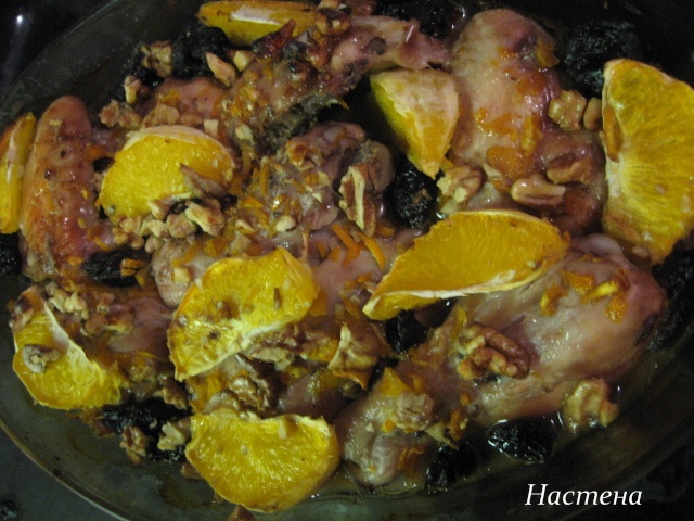 Курица с апельсинами, черносливом и орехами