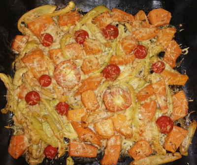 ![]() К тыкве в этот раз добавила перчик с помидорчиками, как раз их нужно было пристроить. Перец остался хрустким, тыква сладкая и помидоры печеные, все это в соусе и с сыром ![]() ![]() |