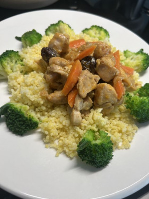 На 3-4 порции: 500 гр мяса (филе) 1 большая луковица 1 большая морковь 50гр изюма или 4-5 шт чернослива, или кураги, или даже финики 4-5 шт (по сути если менять сухофрукты будет каждый раз новый оттенок вкуса) 150-200 мл кокосового молока или сливок 1 -2 ст л оливкового масла 1 перчик чили 1-2 ст л кедровых Орехов или кешью, еще интересно с арахисом(это опционально) 1/2 чл корицы Соль, перец Для подачи зелень. Тут хороша кинза. Мелко нарезать мясо, Лук полукольцами, Морковь крупно Сухофрукты промыть и ошпарить; На сковороде или в сотейнике обжарить на оливковом масле чили и мясо, затем лук и морковь. Добавить сухофрукты. Посолить, поперчить, влить кокосовое молоко, припудрить корицей и оставить тушиться на среднем огне на 15 минут. Перед подачей посыпать рубленными орехами и зеленью. Гарнировать с любой крупой от кус куса до зеленой гречки и с пшеном это тоже очень вкусно. |