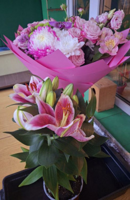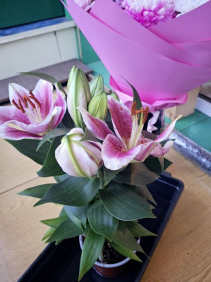 Еще Лешка мне купил горшочек с лилиями. Хотел порадовать, когда я с давлением слегла.