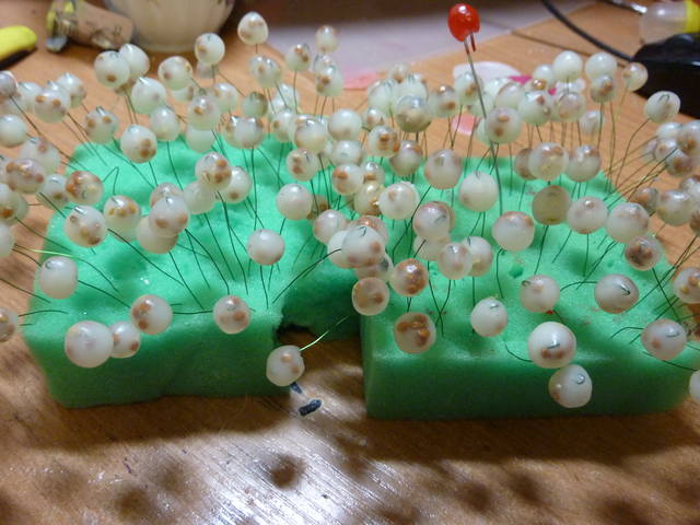 Надежда! Прогрей ещё глину в микро, сек 10, сделай поплотнее, чтобы петельки не выходили с верху. Можно накатать ягодок, отложить, чтобы они остыли от тепла рук, потом проволочку вставляй, но петельку в клей обмакни, тогда она легче в массу будет входить и не оставлять с низу ямочку. У меня после прогревания ещё глина прозрачнее стала. Свари побольше в прок, через месяц она только лучше становится. Если покажется. что перевар, как бы резиновость появится, в плёнку ещё тёплую оберни, она размякнет. Я сразу глину окрашиваю. Не понравилось витражной краской красить. Если ягодку чётко вертикально не поставить, капли лака затекают и неровность окраски получается. Дай ещё несколько дней ей постоять, мутность уйдёт, высохнуть должны основательно. Я проволочки сразу обкатываю глиной, так переход от ягодки к стебельку почти не заметен. Это только из своего опыта. А вообще молодец, быстро сделала, семечки как у настоящей смородины, хомяка голодным оставили.