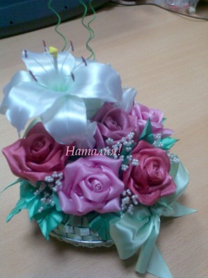 выставлю и свои работы на ваш суд и заказ на свадьбу.лилии заказали для украшения машин гостей,целую кучу пришлось наделать бутылочки на стол жениха и невесты и букет дублер |