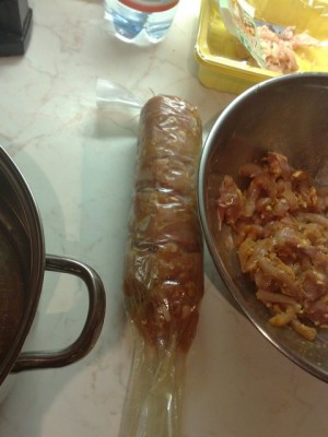 Вот сами пакетики На них прям написано "кишка" для холодца (холодец у них продается батоном колбасы...) Они и пошире и поуже есть..... Мы в узших мутили ща.... Завязали... Мяса напихали... с другой стороны тож завязали и варится теперь... По-принцыпу как в пакете от молока или сока... Я так подумала,что раз холодец у них варится и все ОК,так и у меня должно получиться... Завтра посмотрим че вышло... |