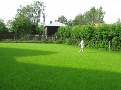 Да, перед домом. Лет семь ему. Сейчас трава сочная, яркая. Хорошо по нему босиком ходить, травка шелковистая! Играем здесь в волейбол, бадминтон. Дети на велосипеде гоняют. Раз в 10 дней косим. Уходит на это не меньше 3 часов. А раньше на месте газона росла клубника. Здесь около 4 соток. Родители ее продавали, а выручка шла на строительство дома. Муж до сих пор клубнику на дух не переносит!