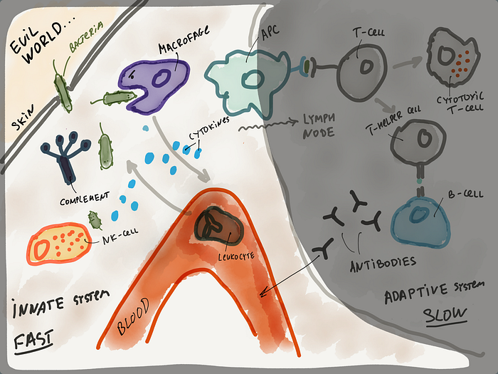 https://medium.com/@mdubakov/immune-system-for-mere-mortals-74de44bdb733 Кратко и понятно основные механизмы и принципы работы одной из самых сложных систем нашего организма. I. Врождённая иммунная система В левом верхнем углу агрессивно настроенная бактерия проникает через небольшую ранку в коже и встречается с неприветливым внутренним миром человеческого организма. Для начала она имеет дело с врождённой иммунной системой