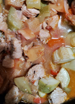 Я сделала все по рецепту, но в мультиварке. Сначала жарка 18 минут, потом тушение 1 час. На 400 гр индейки полторы айвы, два кабачка, один перец, один помидор.