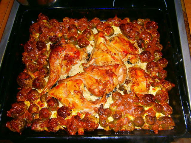 Ням-ням-ням!!!! Дорогие кулинары, хочу поделиться с вами своим рецептом приготовления кролика... Нам понадобится: 1 кролик 1 кг или больше брюссельской капусты 3 яйца 2 ст.л. нежирной сметаны 150-170 гр творожного сыра (если у вас не продаётся,то можно приготовить по одному из рецептов, представленных на сайтею Ну или в крайнем случае заменить на мацареллу) 3 зубчика чеснока Оливковое масло соль и специи по вкусу Итак...Разрезаем кролика на части, солим, перчим, посыпаем измельченным чесноком и поливаем оливковым маслом. Хорошо втираем все в кролика( Можно прямо на противне). У брюссельской капусты слегка вырезаем основание, чтобы не горчила и выкладиваем вокруг кролика. Сыр натираем на крупной терке, добавляем сметану, яйца и любимую приправу. Все перемешиваем. В противень наливаем воды...немного. Затем немного посыпаем солью капусту и выкладываем на неё соус. Запекаем в духовке при температуре 180-200 градусов часик.... Приятного аппетита! |