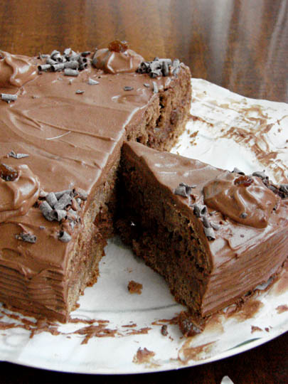 Домашний (во всех отношениях) торт. Рецепт - из старой книжки. Ничего сложного, но оригинально из-за изюма. В реальном рецепте продуктов в два раза больше - и коржей 4, а не 2. Но я немного упростила. Итак: 140 гр муки 1 ст ложка крахмала 1 ст ложка какао 70 гр сахара разрыхлитель (сда) 4 яйца (белки и желтки раздельно) Белки взбиваем в пену. Желтки взбиваем с сахаром в течении 5 минут - должна получится густая белая масса. Все сухие ингредиенты смешиваем. Белки смешиваем с желтками, постепенно добавляем сухие компоненты. Выливаем в смазанную маслом и посыанную мукой форму. Выпекаем около 35 минут при 160. Остужаем. Разрезаем на 2 коржа. 50 гр изюма 100 гр сахарного песка 200 мл воды 2 ст ложки коньяка (рома) 200 гр сметаны (густой) 150 черного шоколада 100 гр сахарной пудры Сахар с водой доводим до кипения, вливаем коньяк, всыпаем изюм. Снимаем с огня и оставляем остужаться. Сметану взбиваем с пудрой. Шоколад растапливаем, слегка остужаем и добавляем к сметане. Вынимаем изюм из сиропа. Сиропом пропитываем коржи. Собираем торт: корж, крем, изюм, корж. Обмазываем кремом. Убираем на пару часов в холодильник. ПРИЯТНОГО АППЕТИТА |