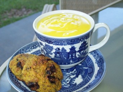 Сегодня попробовала сделать по-нашему. Но чуток куркумы пересыпала, поэтому у меня Желтый горячий шоколад. С нашими творожными печеньками конечно.