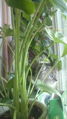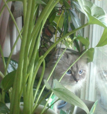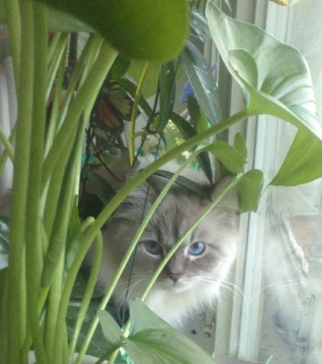 Марсик редко стал на стол запрыгивать, когда я за компом сижу, в основном спит или на кровати в спальне,или на диване в гостиной. Даже на окно редко запрыгивает. Здесь под окнами нет таких деревьев, как было на той квартире, только недавно их посадили. Птичек не видно, смотреть не интересно.