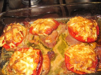 Свиные отбивные запеченные с помидорами, сыром и луком
