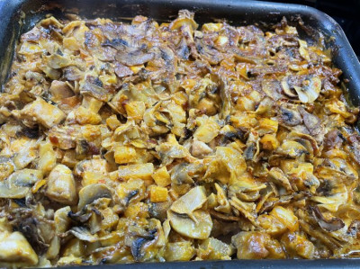 Да, чтобы ничего не варилось, заранее кроме мяса, обжарила шампиньоны, чтобы дали воду и отдельно перец, чтобы тоже воду отдал, остальное по рецепту. Очень неожиданное сочетание кокосового молока и сливок, обычно делала либо со сливками, либо с кокосовым молоком, никогда не смешивала, но получилось вкусно. Ананас взяла консервированный из банки, но, если честно, его совсем в блюде не чувствуется. На гарнир сварили рис. |
