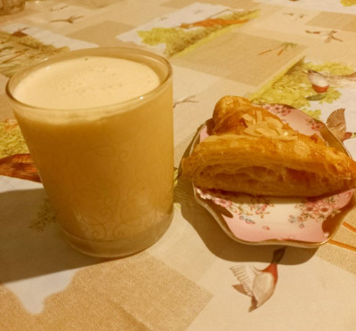 девчонки, жаль, что одной картошкой то не обошлось!!! я еще купила миндальный круассан, хотела на второй завтрак его сегодня взять. но ночью и его заточила, с ряженкой))) и, как деловая ж, отрезала половинку))) а в итоге весь съела